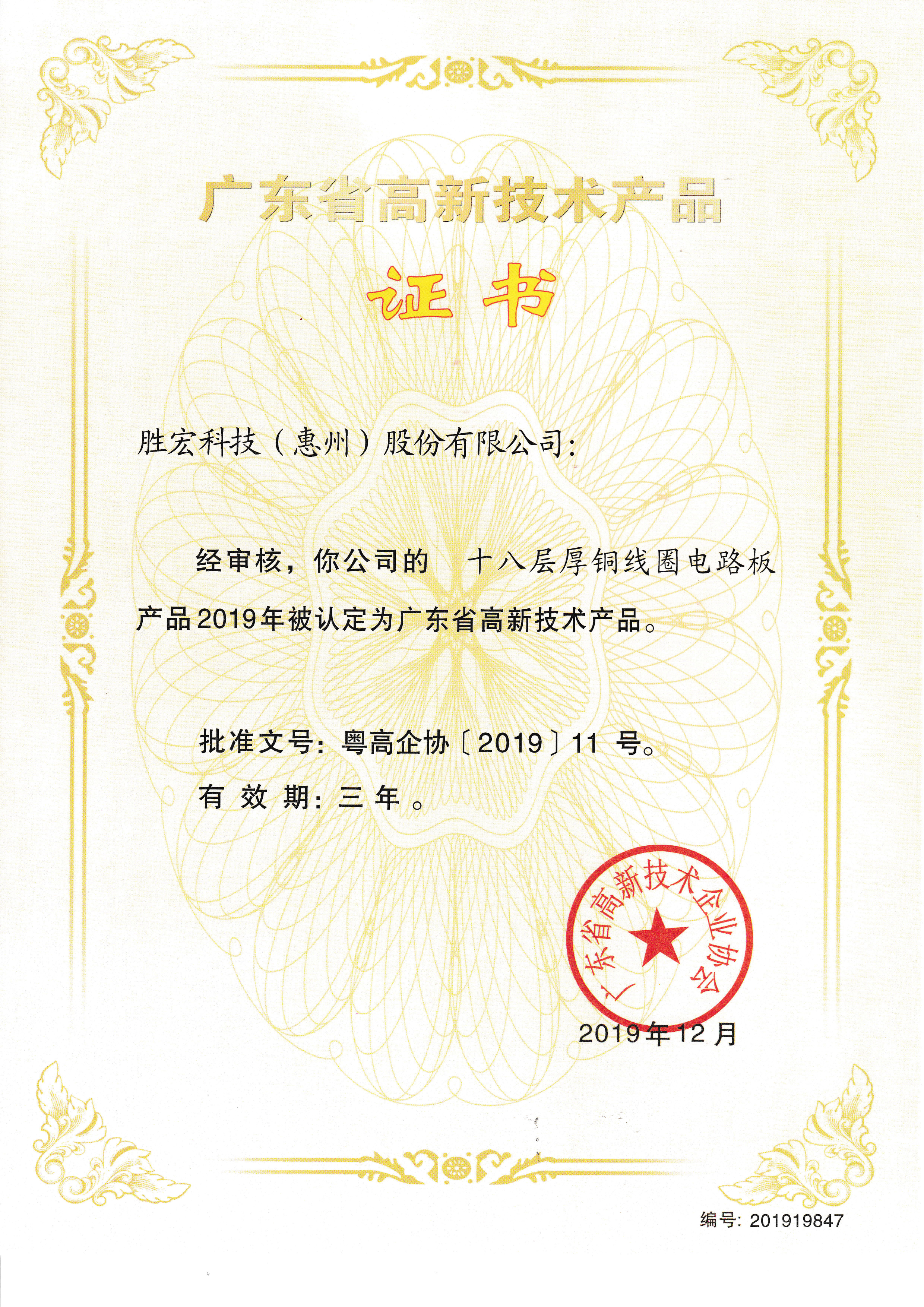 “高端高频电路板”名优高新技术产品证书